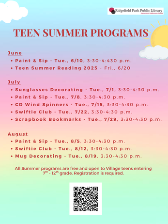 Welcome to Ridgefield Park Public Library's Teen Department! Here you can find out about upcoming programming, events, new books, helpful online resources and so much more. If you have any suggestions on how we can improve the teen department from programming to new books please let us know by e-mail or just dropping by! We are always happy to see you!